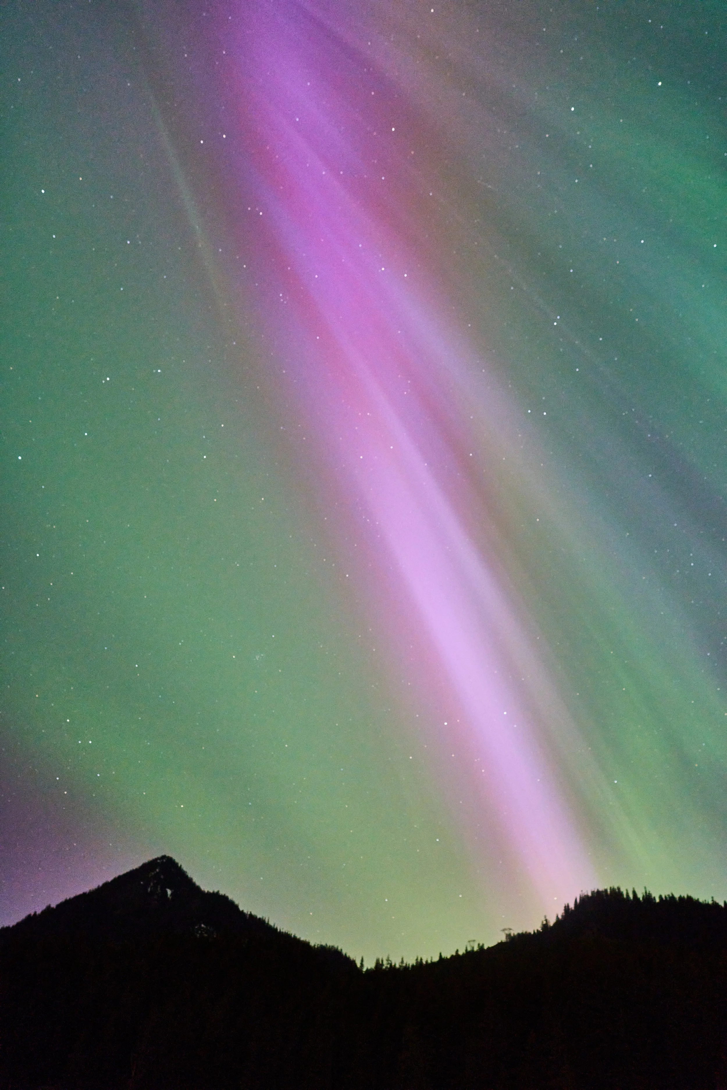 About 2 hours after sunset, the show started to take on a new appearance. The small, dim dance low on the horizon grew. White light turned to green light, and then pink, and finally deep magenta.